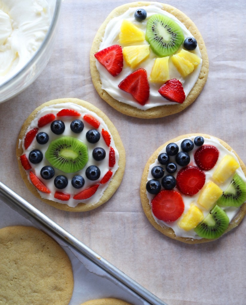 Directions: Cut sugar cookie dough into 6 equal parts. Flatten each cookie dough part into a ¼” circle. Lay all 6 cookies on a parchment paper covered baking sheet. Place in freezer for at least 30 minutes. When chilled, remove cookies from freezer and bake for 12 to 15 minutes until slightly golden around edges. Remove from oven, let sit for just a minute and then move to cooling rack. While cookies cool, mix cream cheese, butter, powdered sugar, lemon juice, and vanilla together until fully combined. Cut fruits as desired. When cookies are cooled, spread cream cheese mixture on each cookie and decorate with fruit. Serve immediately.